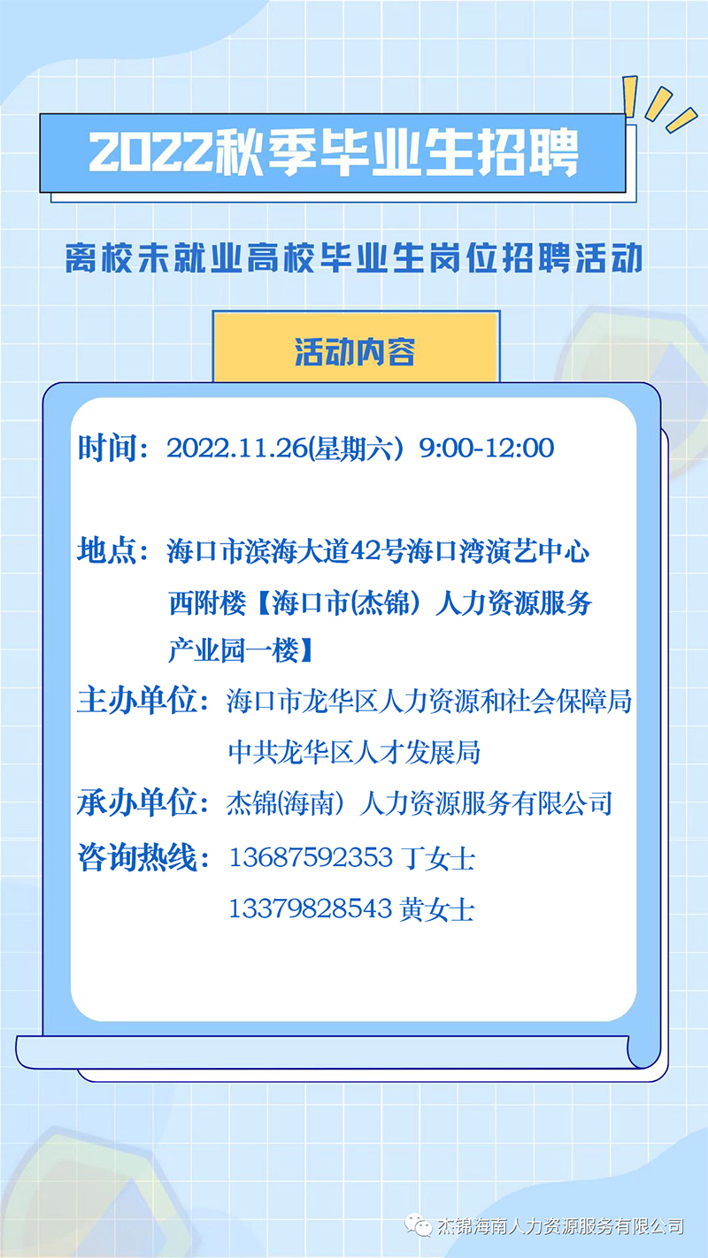 隨著疫情形勢逐步向好,市場環(huán)境、經(jīng)濟形勢迅速復蘇,企業(yè)單位用工需求增大。加之畢業(yè)季來臨,高校畢業(yè)生群體就業(yè)需求激增。為幫助用人單位更好的招納人才,讓廣大求職者找到理想的就業(yè)崗位,我司將在??谑旋埲A區(qū)人力資源和社會保障局、中共龍華區(qū)委人才發(fā)展局指導下積極搭建用人單位和求職者雙向選擇平臺,將于11月26日舉辦招聘會活動。
